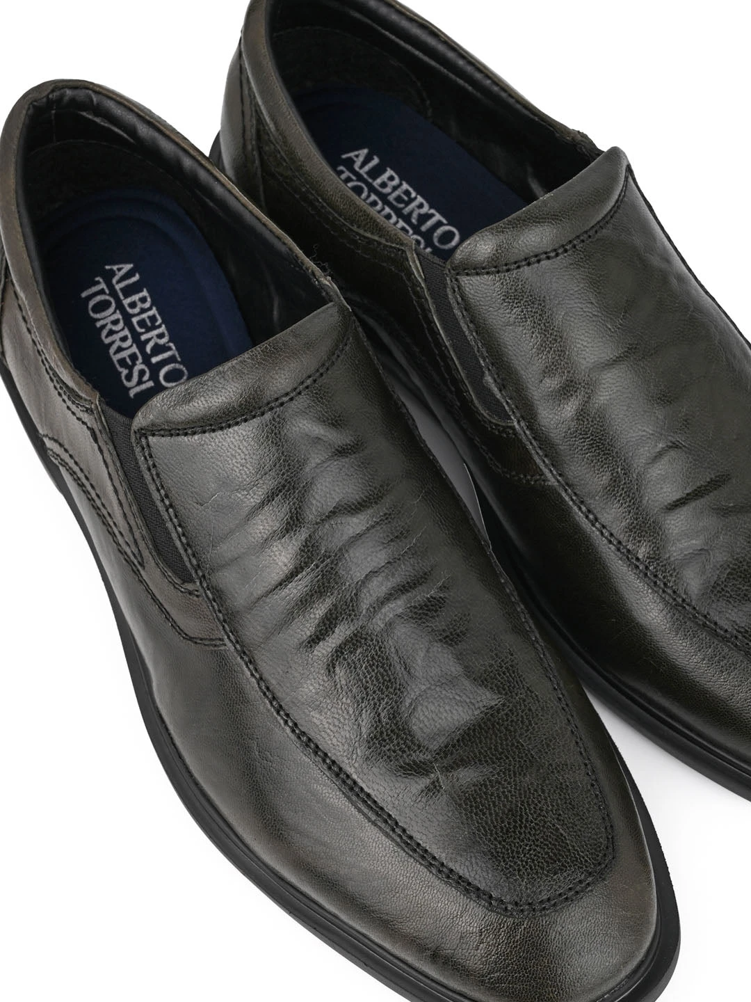 This innovative shoe blends the style of a formal with the comfort of a sneaker. Featuring an EVA sole for durability and lightweight wear, it offers sneaker-like comfort with cushioned footbeds and a broad fit for all-day support. The upper is crafted from unique crinkle leather with a glossy finish, while Lycra inners ensure breathability and foot protection. Side elastics make slipping in and out effortless, combining function with modern style.